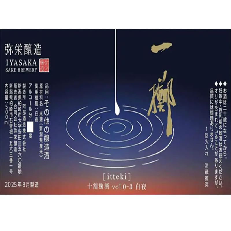 | 商品名 | 弥栄醸造 ITTEKI(一擲)十割麹酒 vol.0-3 白夜 (いやさかじょうぞう いってき じゅうわりこうじさけ びゃくや) |
